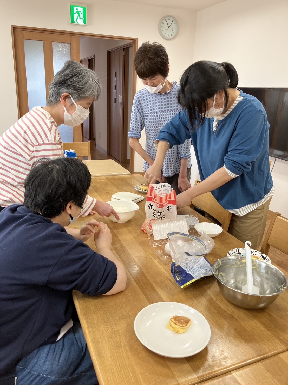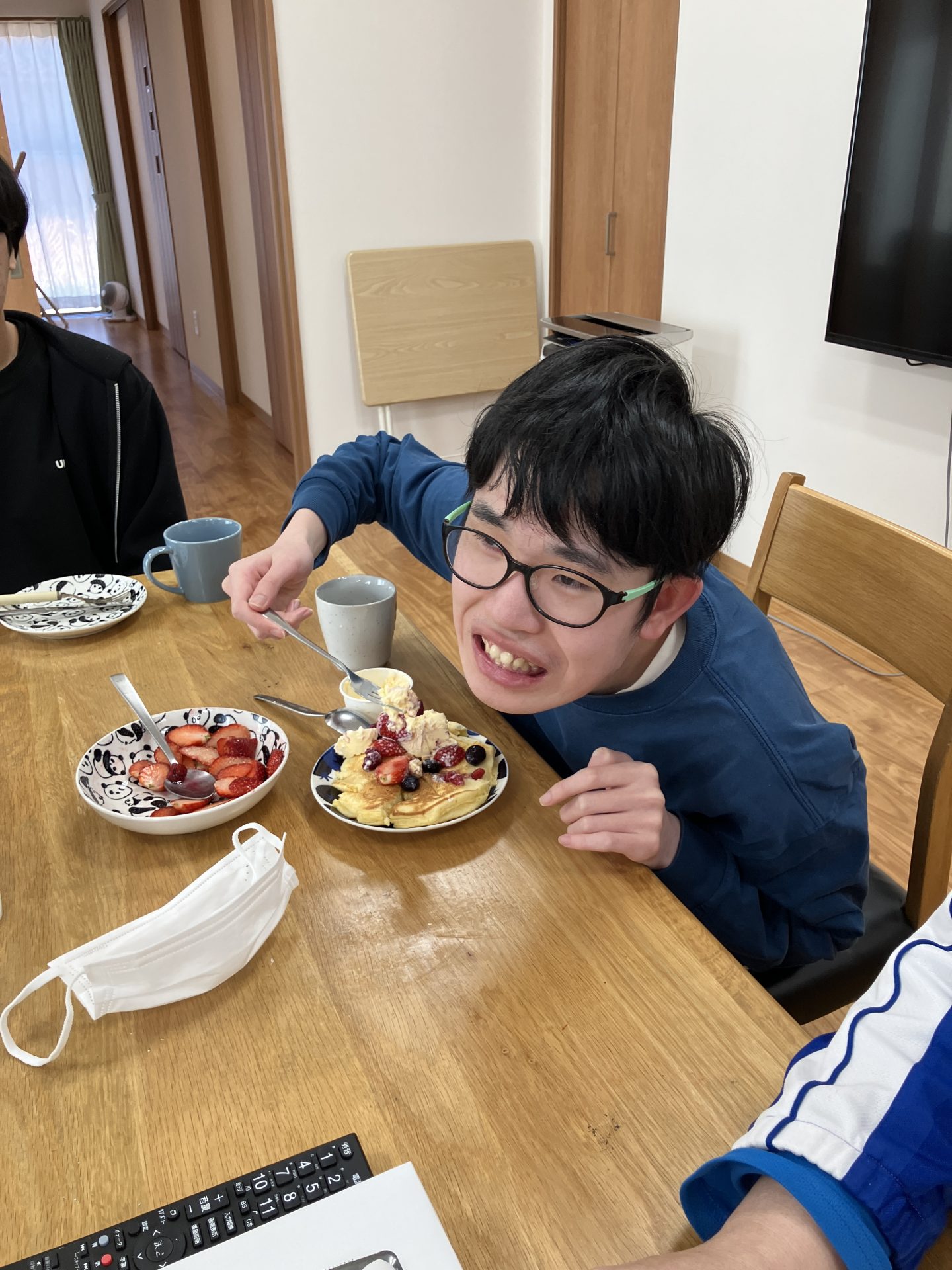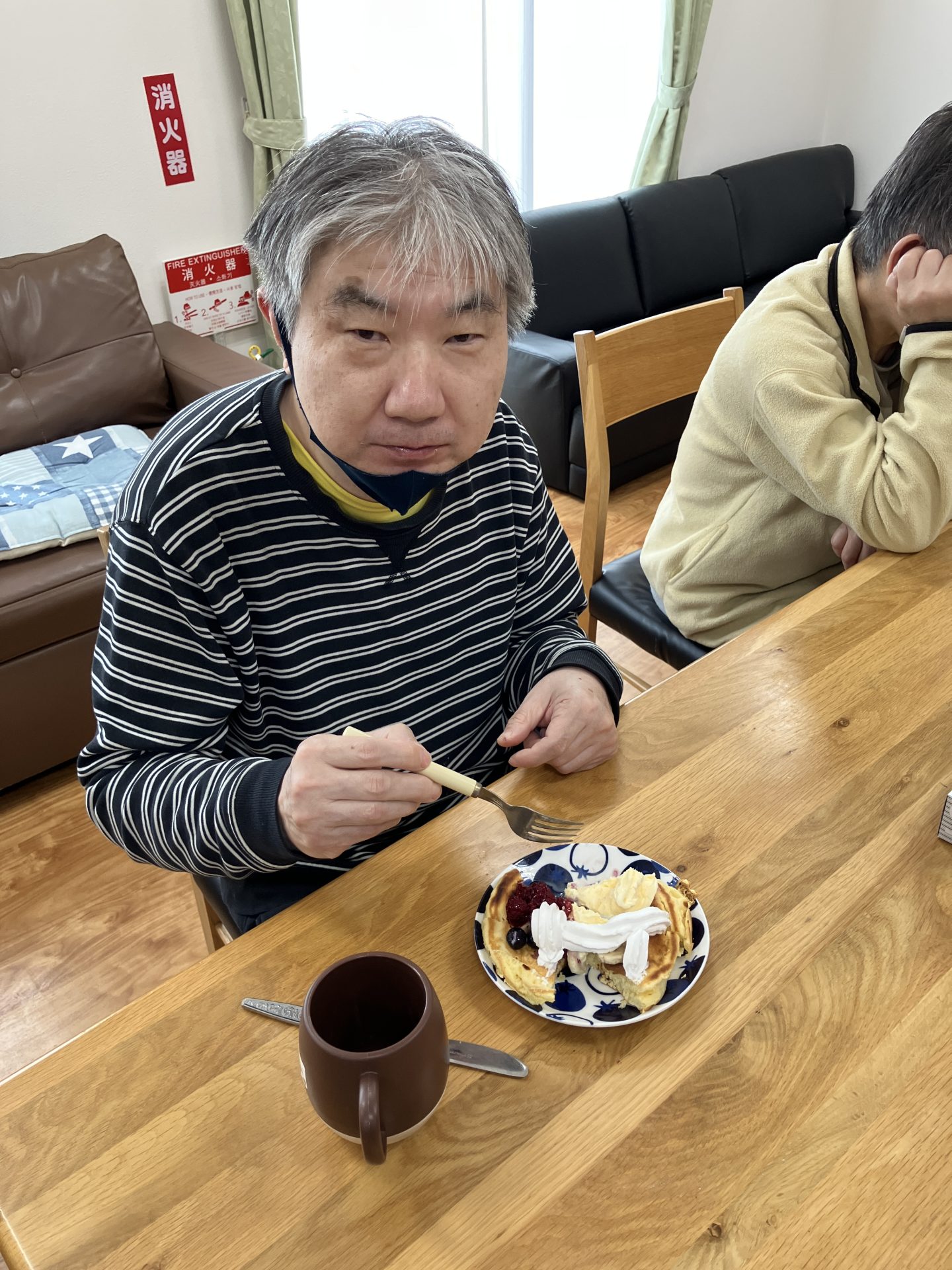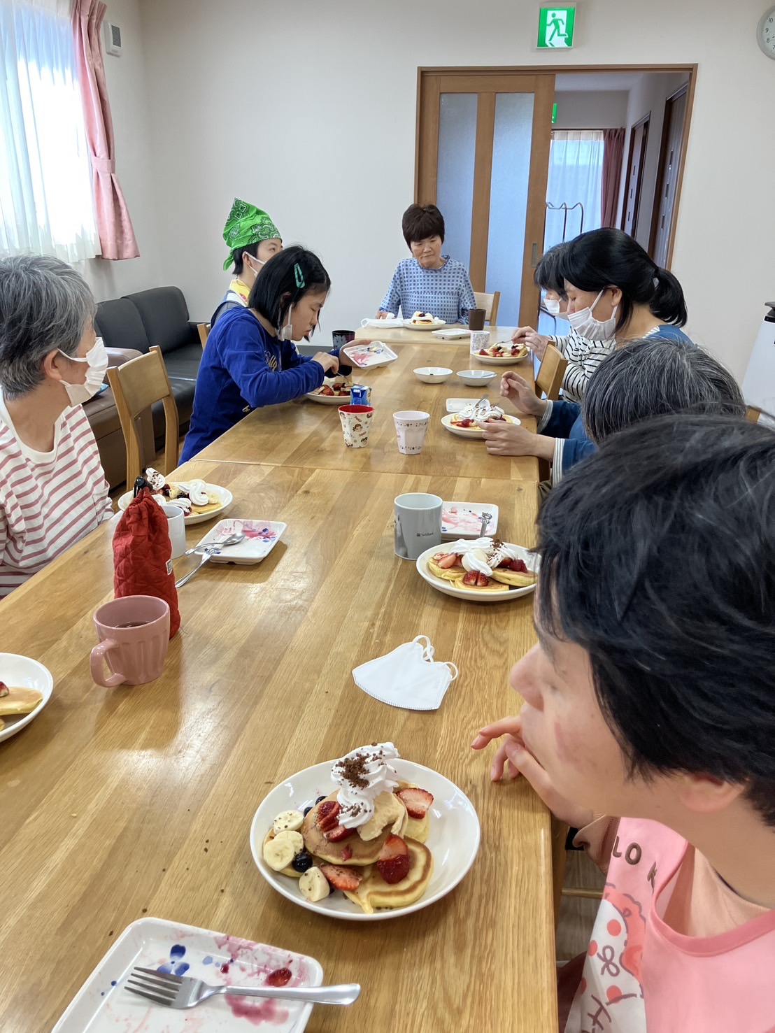 2026.04.16 GH/長江 みんなで楽しくパンケーキ作り 楽しくパンケーキを作りました。 生地を混ぜたり焼いたりと、それぞれが出来る事に取り組みながら、楽しそうな様子が見られました。 いちごやクリームをのせて、オリジナルのパンケーキ作り! それぞれ個性が出ていて素敵でした。 みんなで協力しながら、楽しく調理することが出来ました。 お昼ごはんは、すき焼き弁当をいただきました。 今後も笑顔あふれる活動を取り入れていきたいと思います。