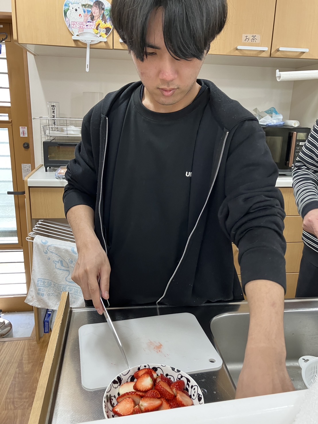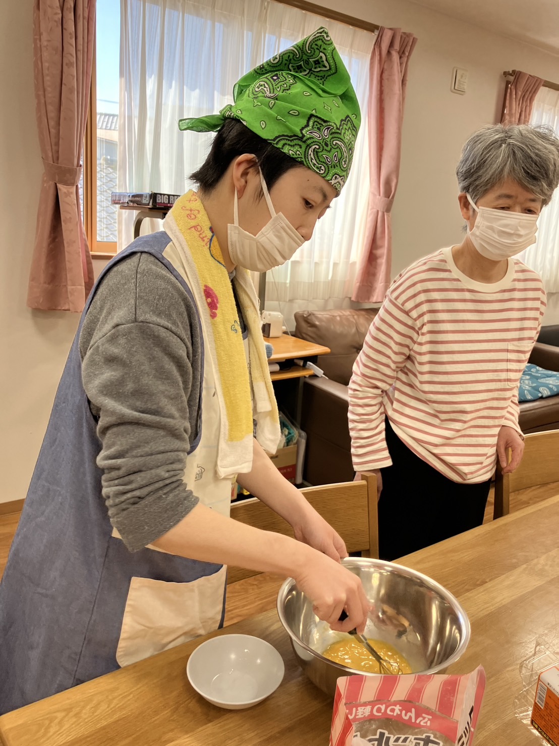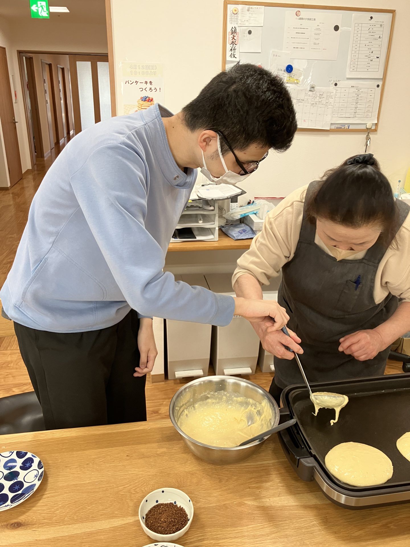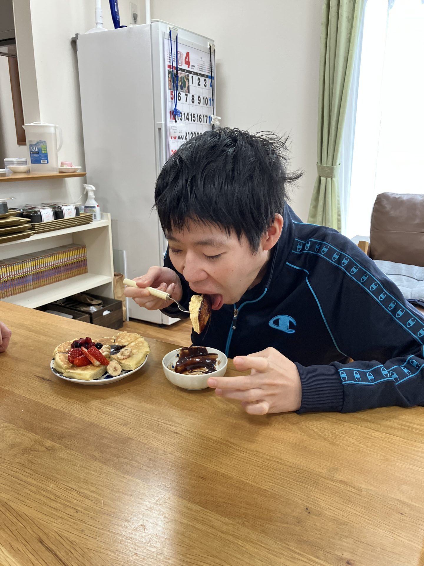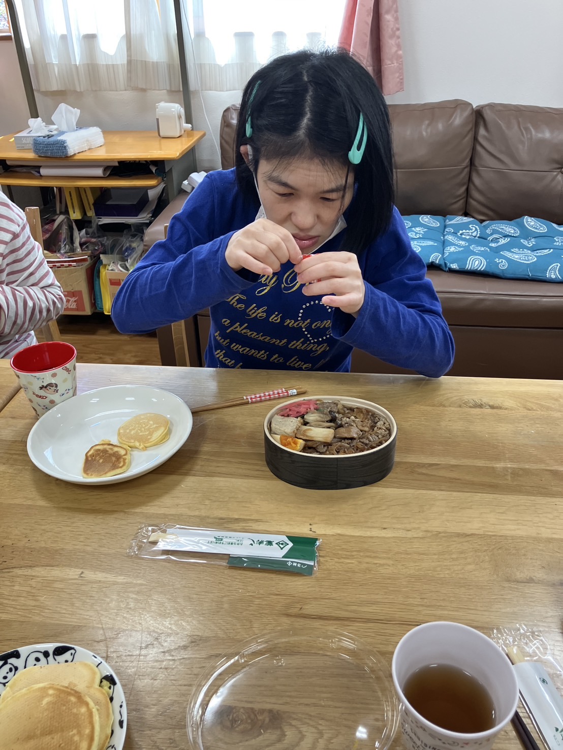 2026.04.16 GH/長江 みんなで楽しくパンケーキ作り 楽しくパンケーキを作りました。 生地を混ぜたり焼いたりと、それぞれが出来る事に取り組みながら、楽しそうな様子が見られました。 いちごやクリームをのせて、オリジナルのパンケーキ作り! それぞれ個性が出ていて素敵でした。 みんなで協力しながら、楽しく調理することが出来ました。 お昼ごはんは、すき焼き弁当をいただきました。 今後も笑顔あふれる活動を取り入れていきたいと思います。