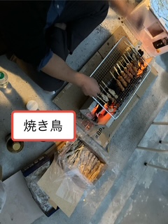 外では炭火で焼き鳥を焼き、おいしそうなにおいとともに