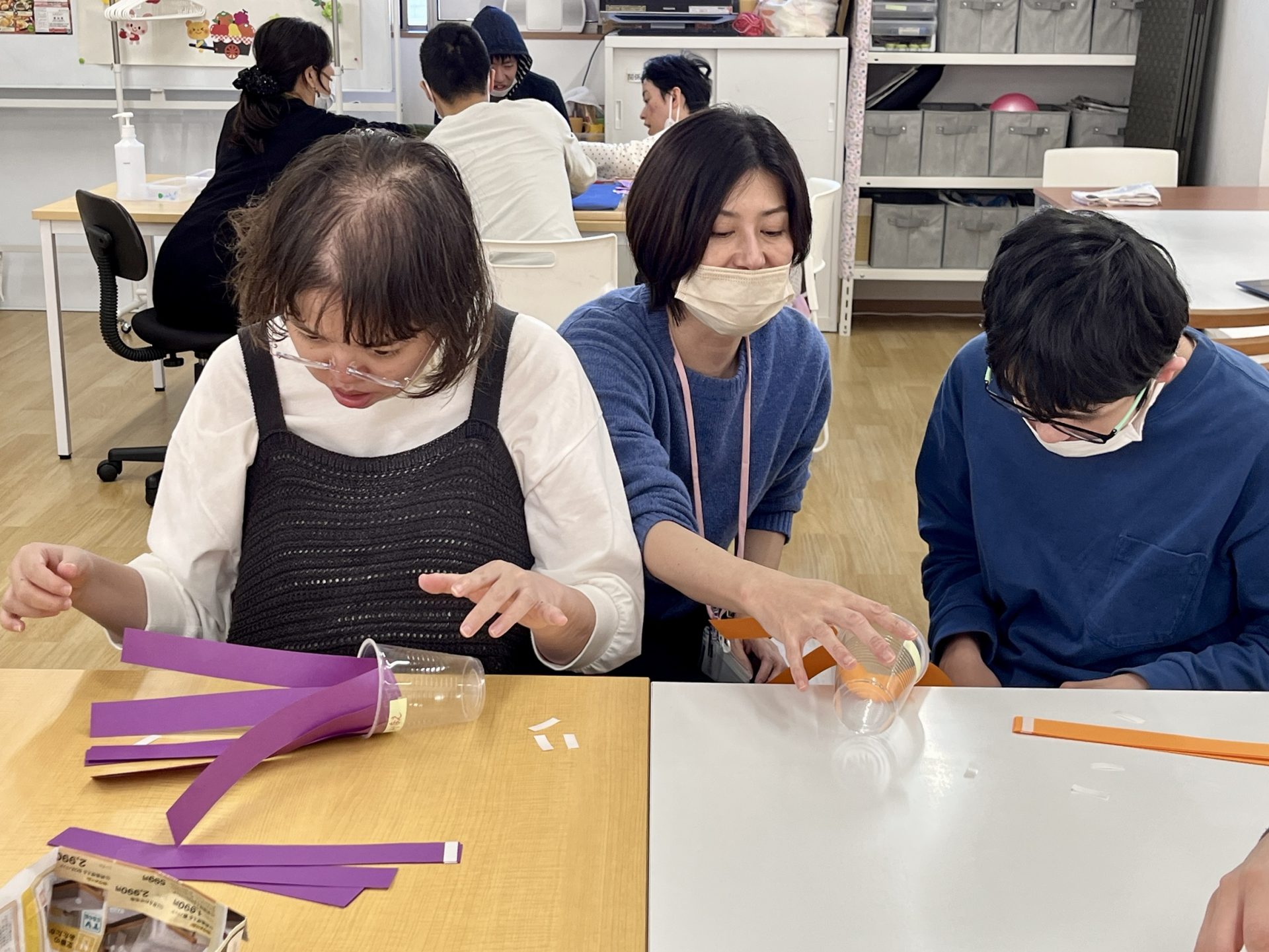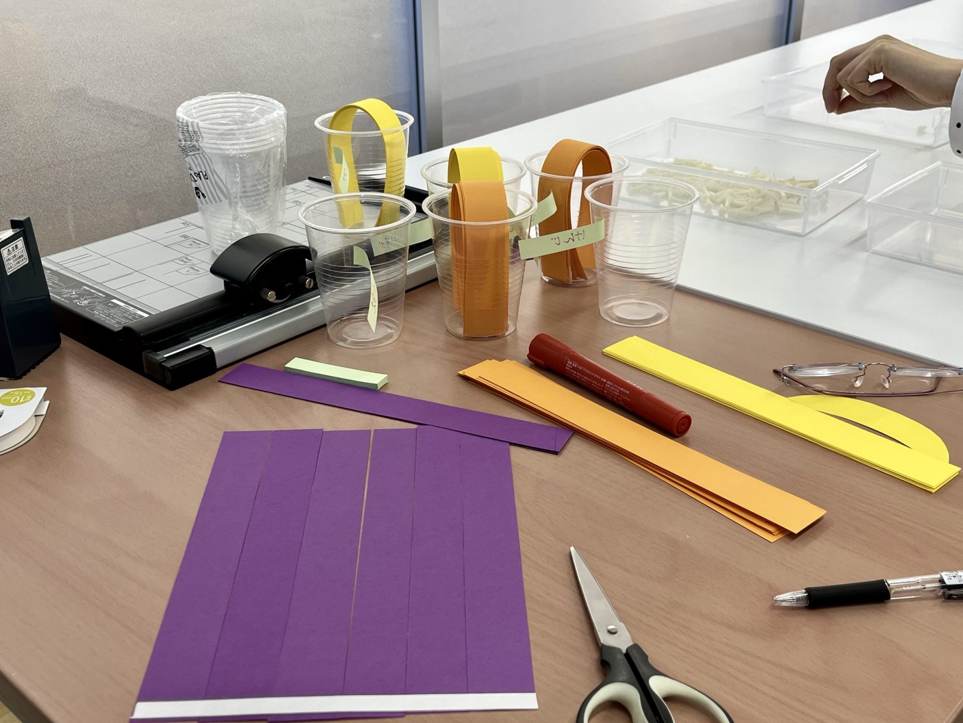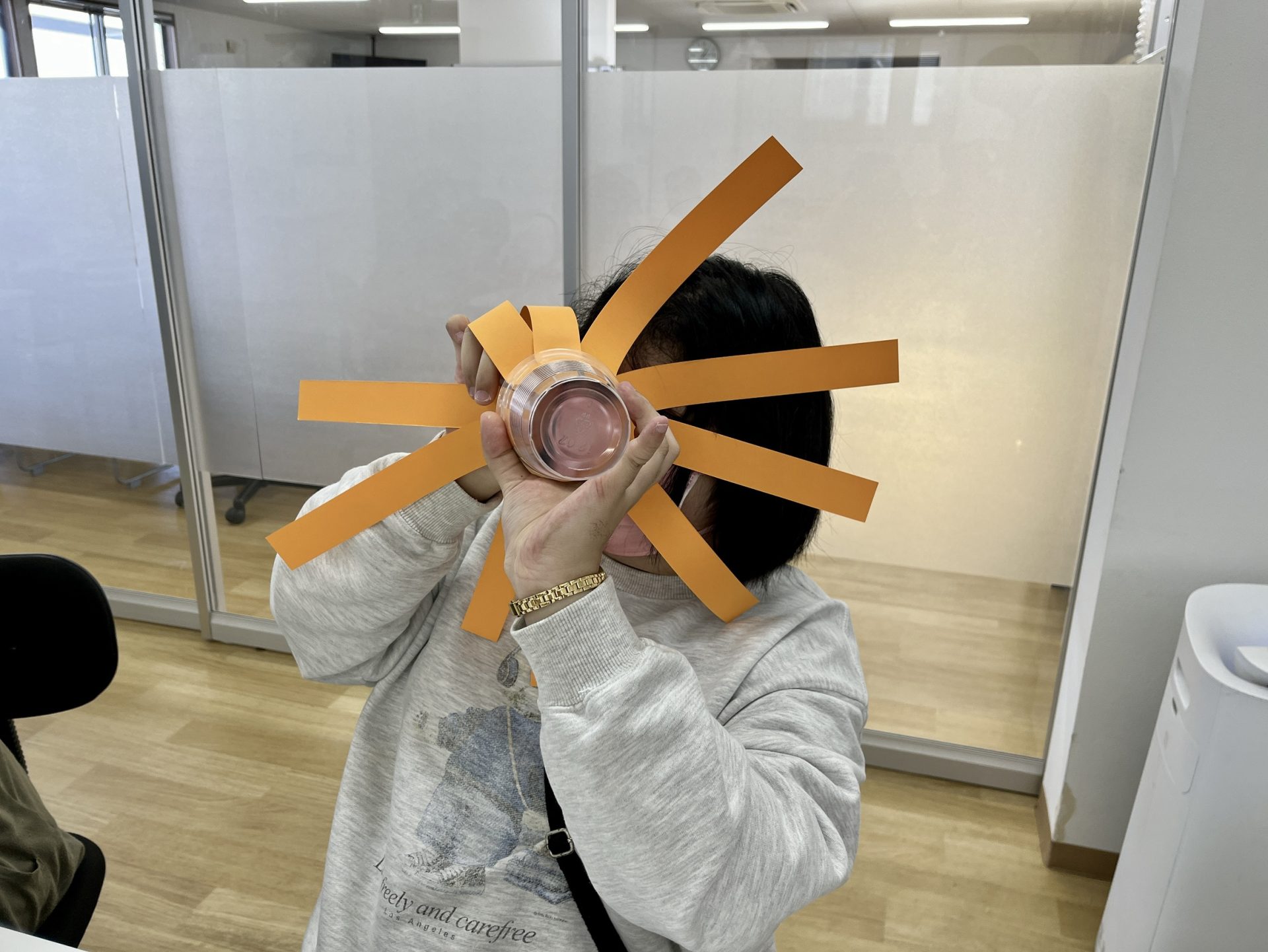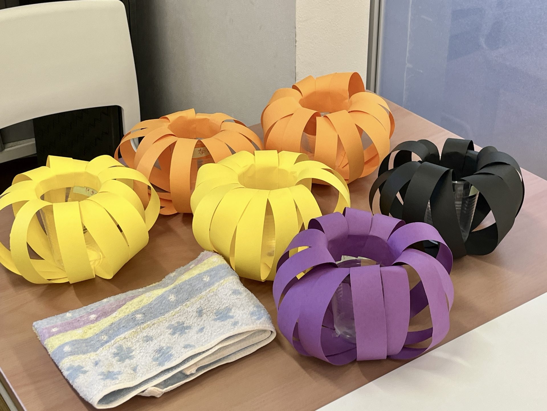 透明カップに細く切った画用紙を放射状に貼りつけて、
