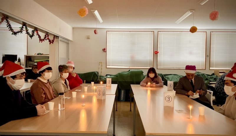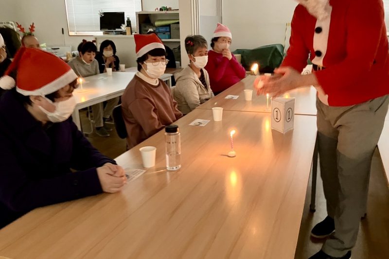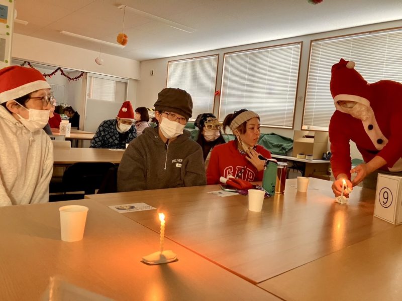 サンタさんは、暖かい灯を届けるように、テーブルを一つひとつ回り、キャンドルに明かりを灯していきます。