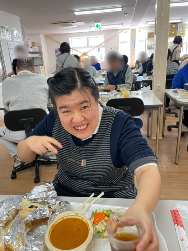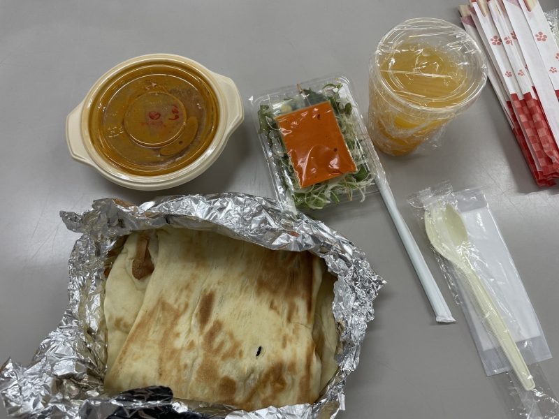 昼食のメニューはチキンカレーかベジタブルカレー、ライスかナンを選択しサラダとオレンジジュースが付くセットをいただきました。