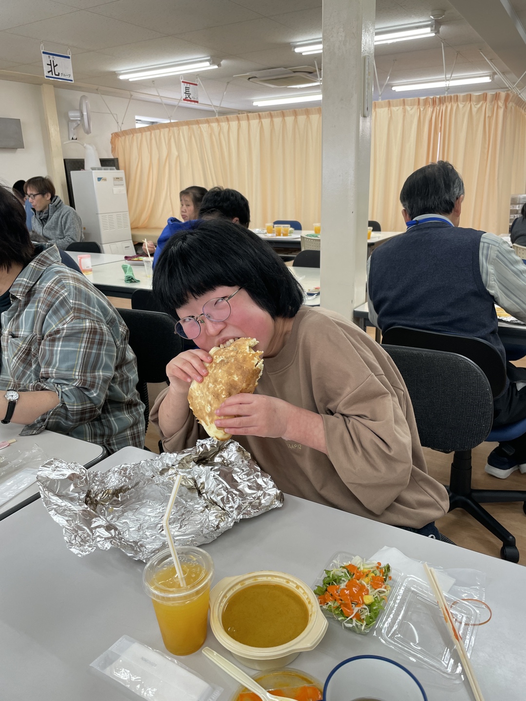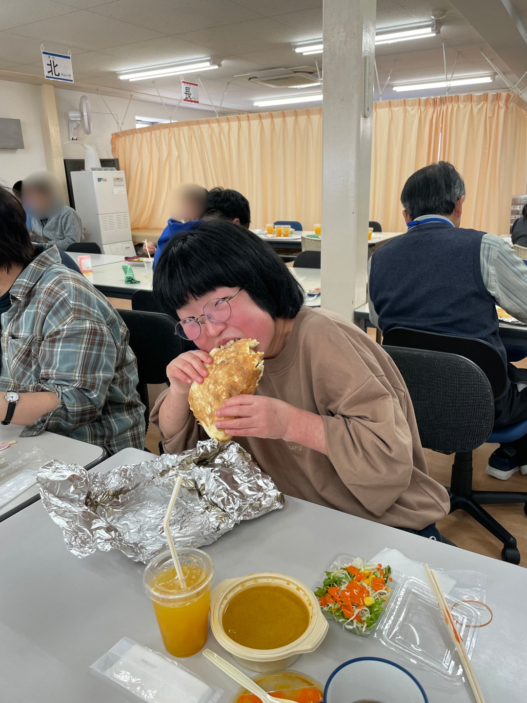 昼食のメニューはチキンカレーかベジタブルカレー、ライスかナンを選択しサラダとオレンジジュースが付くセットをいただきました。