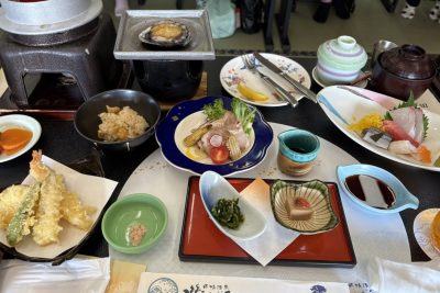 アワビに天ぷら、栗ごはんなど「おいしいね」「アワビ初めて食べた」と会話もはずみ笑顔がこぼれました。